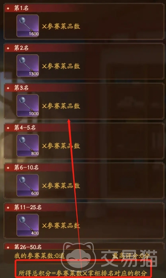 因此,在比赛的时候,我们上更多菜品的数量以更高分数的菜品带低一分数的菜品,则会有更好的积分优势。毕竟我们比赛排名的所得分是根据我们,参赛的菜品数量在最后乘以我们掌柜排名所对应的积分获得。比如说我们总共上了十道菜,最高分的菜品拿到了第二名或者第三名的分数,那么最后的总得分就是十道菜乘以我们最高菜品积分第二名或第三名的分数,即10×1000。
