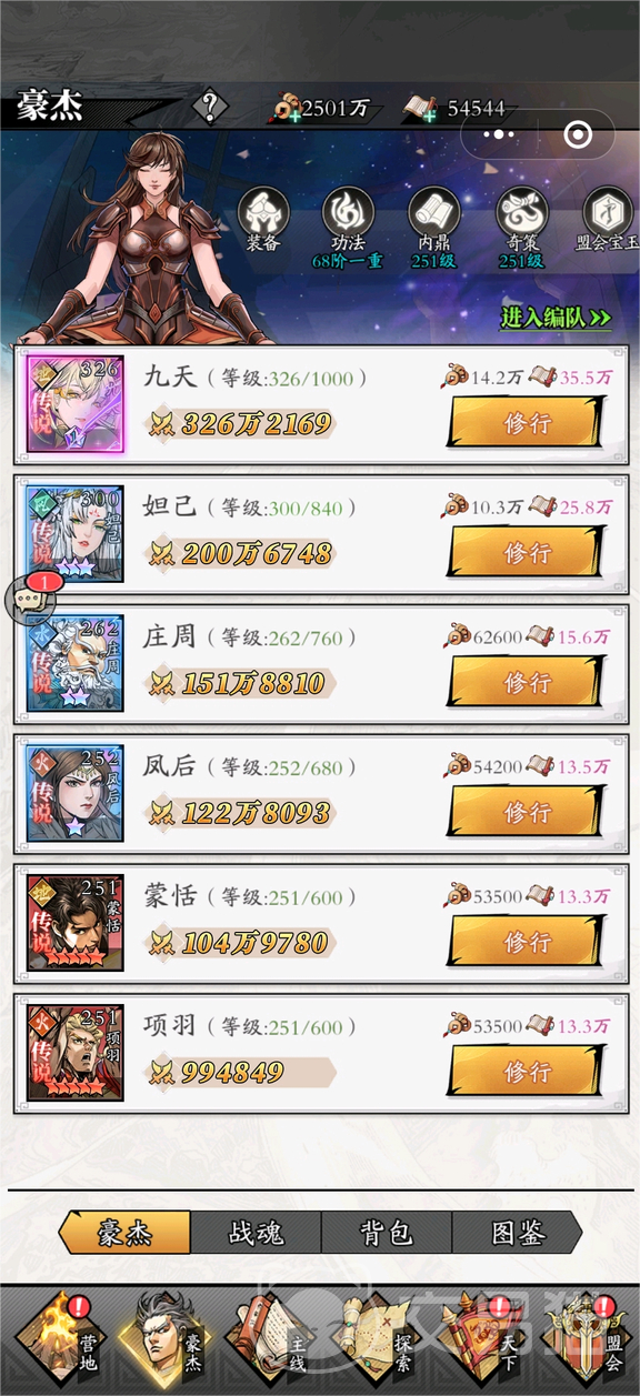 首先来说说英雄养成的问题。在春秋玄奇中,英雄最高品质为传说,由于这类英雄在游戏内出率还是比较低的,因此不建议各位轻易将其作为突破素材给其他英雄使用,通常的做法往往是将稀有品质和史诗品质的英雄作为素材使用,考虑到游戏中英雄升星后可以获取稀有材料功法碎片,因此建议大家先将这些英雄升满星之后再作为素材使用,这样不但可以给其他传说英雄突破,同时还能够节省出大量的功法碎片来提升英雄的功法属性,可谓一举两得。最后,如果各位抽到了前期过渡阶段使用的英雄的上位替代,那么可以使用元宝来将原先英雄的等级和强化重置,这样就可以将其升级所用的材料回收了。