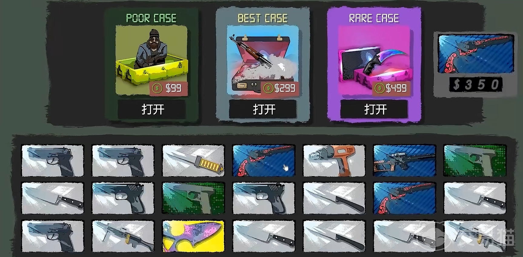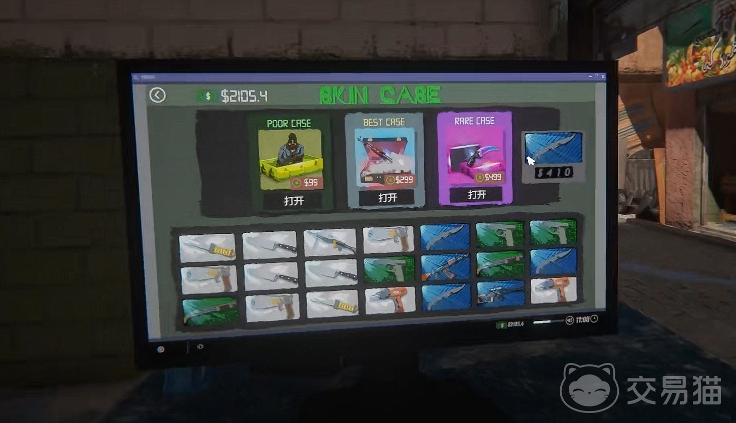 购买之后,他会给我们3x7,总共21个盲盒选项。我们可以随意挑选我们所想要的盲盒进行开启,其开出的物品价值从最低的普通小刀到高级的枪皮,价格不等。便宜的话,99的箱子只能买15的电钻,贵的话,直接99箱子开到399的大狙皮肤。净赚300块,而且成本又低,来钱又快。