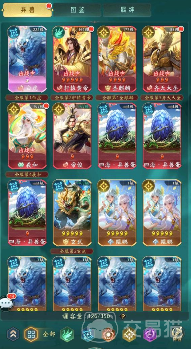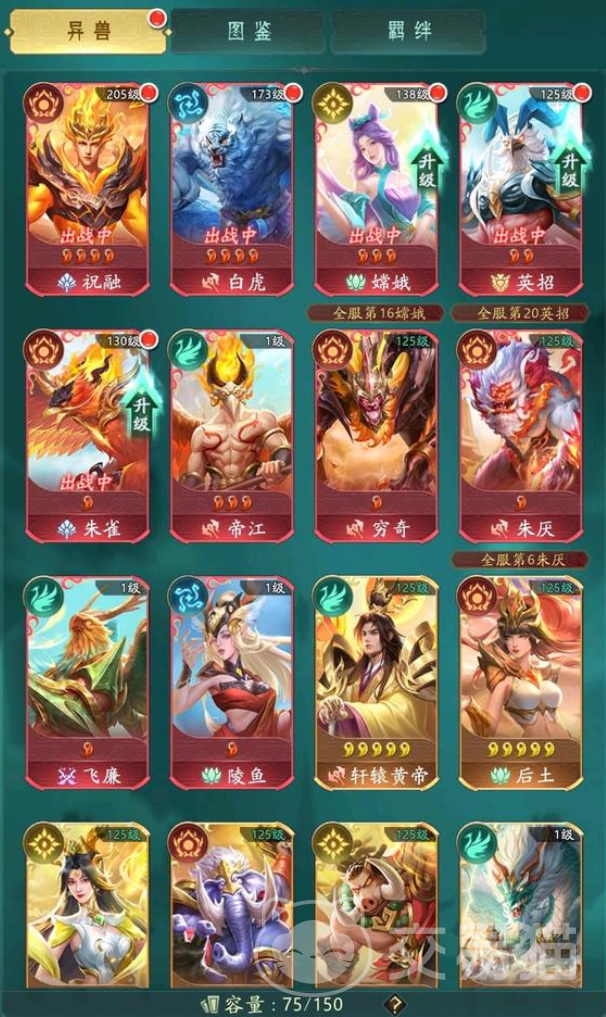 战士组合:白虎+玄武+禹+饕餮+羲和。这是一套防御型的阵容,白虎和玄武是前排的护卫,可以用白虎领域和玄武领域保护己方的异兽,让他们不受敌方的控制和伤害,白虎还有优秀的闪避和免控能力,可以让对方的强力一击无效。禹和饕餮是中排的战士输出,可以用禹的水流攻击敌方的前中排,并且给予湿润的控制效果,饕餮可以用饕餮之力攻击敌方的后排,并且给予饥饿的控制效果,让敌方的异兽无法使用技能。羲和是后排的法师输出,可以用羲和之力攻击敌方的全体,并且给予燃烧的控制效果,让敌方的异兽持续掉血。能打能抗非常万金油,但是输出端在拉锯战中会略显欠缺,比较怕高恢复的阵容。