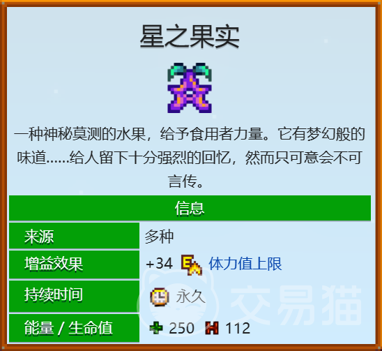 星之果实是一种紫色的水果,上面有一颗星星的图案。它有着神秘的力量,可以给食用者带来梦幻般的体验。食用星之果实时,玩家会想起自己最喜欢的东西,这是一个有趣的彩蛋。星之果实的最大作用是可以增加玩家的能量值上限34点,这对于玩家来说是非常有用的。玩家的初始能量值是270点,如果收集齐所有的鹅话,mp上限就可以达到508点。能量值越高,玩家就可以做更多的活动,比如种植、采矿、钓鱼等,这样就可以更快地发展自己的农场。