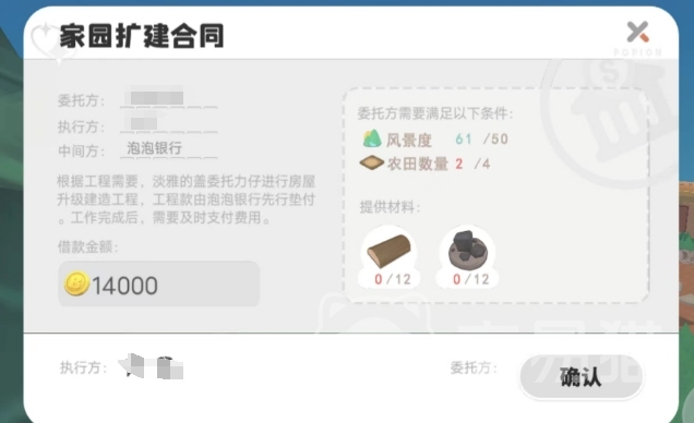 至于具体是什么条件可以从茉莉提供的扩建合同中看到,一般“风景度”和“农田数量”都是硬性指标,前者可以通过放置家具来提升,后者则需要你除开杂草,新建农田来完成,除了这两项指标以外,你还得准备足够的材料,包括原木,铁矿石等等,越到后面,扩建时需要的材料就越多。