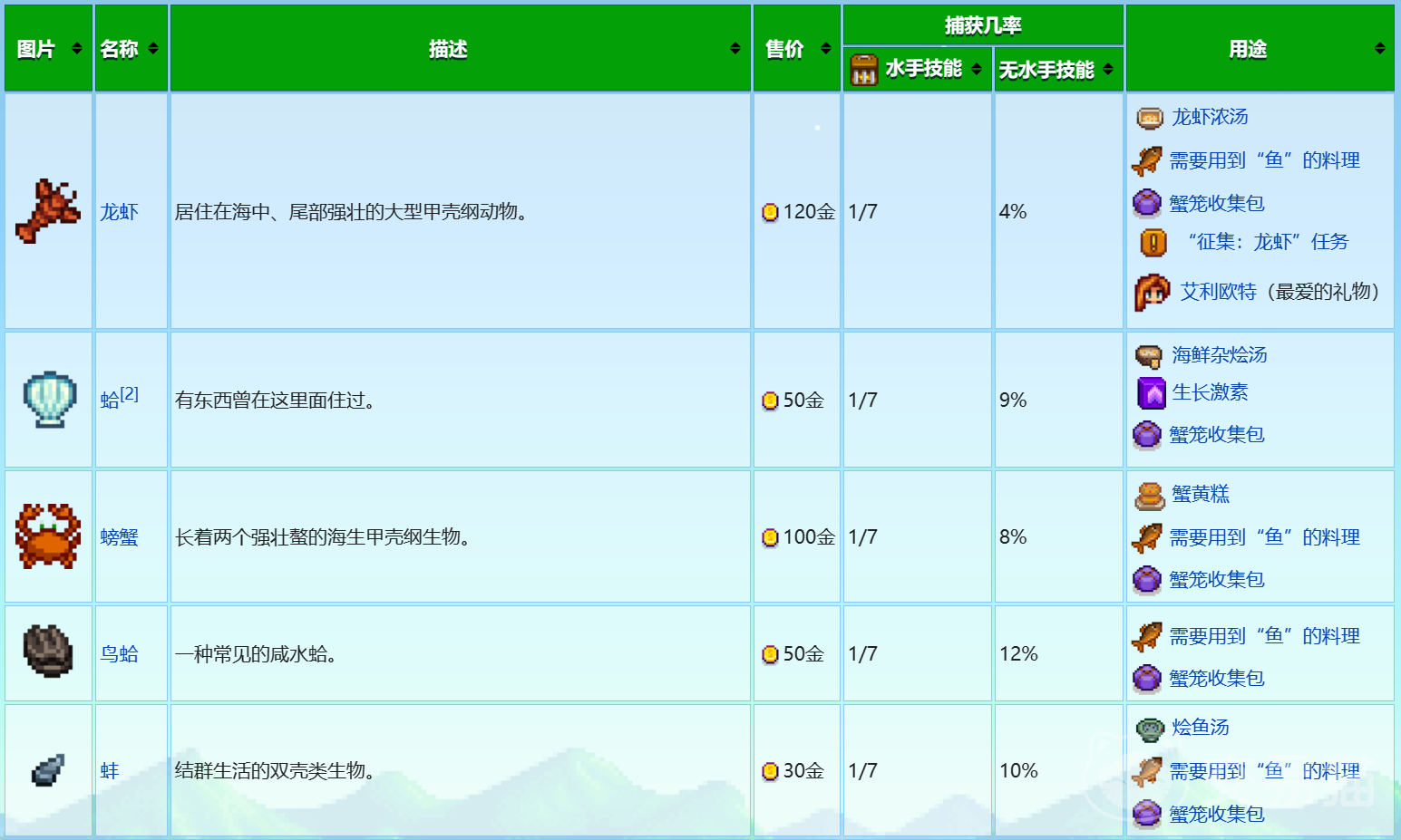 蟹笼是一种可以放置在水中的工具,可以用来捕捉龙虾、螃蟹、蛤、蜗牛等水产。蟹笼的制作需要达到钓鱼等级3,然后用40个木头和3个铁锭打造。如果选择了捕猎者这一职业,那么制作蟹笼只需要25个木头和2个铜锭。蟹笼也可以在鱼店以1,500金的价格购买。