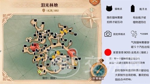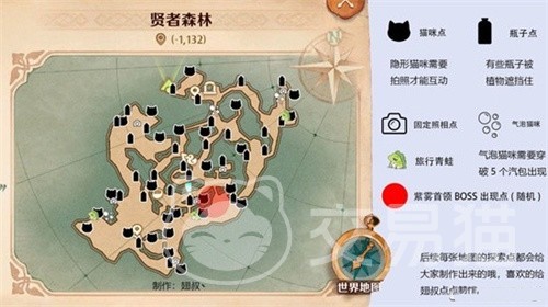 猫咪点:贤者森林有十一个猫咪点,分别是贤者、小狐、小熊、小鹿、小兔、小猫、小狗、小鸟、小鱼、小蜜蜂和小蝴蝶。贤者是森林的守护者,和它互动可以获得属性丹。其他的猫咪都是森林的居民,和它们互动可以获得猫灵抽卡券。其中,小鱼、小蜜蜂和小蝴蝶是隐藏的猫咪,需要用特殊的方法才能找到。小鱼需要在河边用钓鱼竿钓出来,小蜜蜂需要在花丛中用喷雾器喷出来,小蝴蝶需要在草地上用网子捕捉。