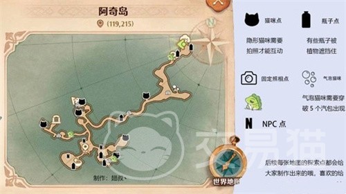 猫咪点:阿奇岛有四个猫咪点,分别是阿奇、小白、小黑和气泡猫咪。阿奇是游戏的主角,和它互动可以获得属性丹。小白和小黑是阿奇的好友,和它们互动可以获得猫灵抽卡券。气泡猫咪是一个隐藏的猫咪,需要穿过五个气泡才能出现,和它互动可以获得时装图纸。