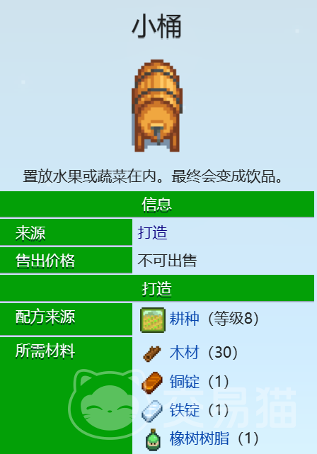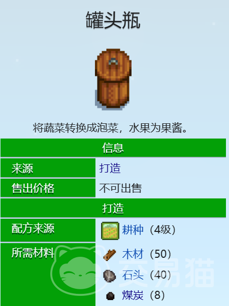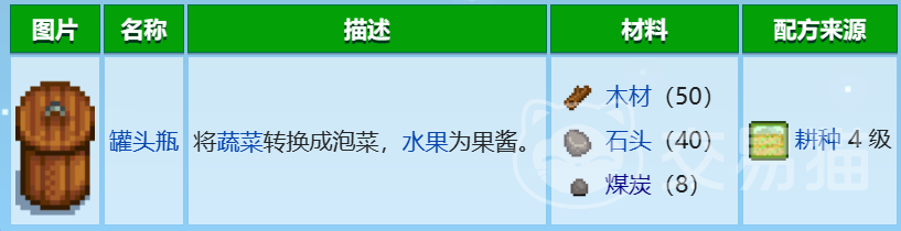 然后我们还要准备一点罐头瓶。罐头瓶是一种可以用来加工水果的工具,你可以在你的制作菜单里找到它。制作一个罐头瓶需要50个木头和40个石头,可以在你的农场或者矿山里收集这些材料。而这个做果酱的罐头瓶容器是能同时拥有多个的。以便同时加工多个水果。而且大家可以多做一些腌菜、鱼子酱、腌鱼籽等产物,它们的配方都是一样的将不同目标原材放置到罐头瓶之中就能产出相应的酱料了。但是大家一定要区分好罐头瓶和小桶,它们都是发酵农作物的桶子,外观非常相似,但是小桶的产出物为饮品,只有罐头瓶产出物才是我们需要的果酱。