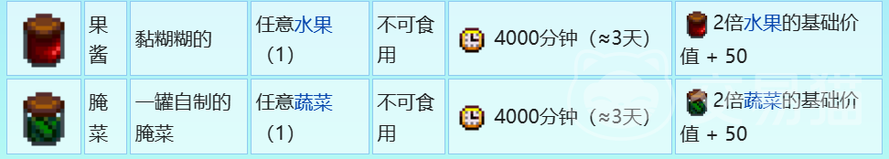 放入水果后,罐头瓶会开始发酵,可以看到罐头瓶上的水果图案和冒出的气泡。需要耐心等待三天,罐头瓶就会完成加工,这时候的话我们就可以收集你的果酱了。果酱的售价是水果的两倍加50金,可以把果酱卖给商店,或者直接送给你喜欢的人,还能提升很高的好感度。