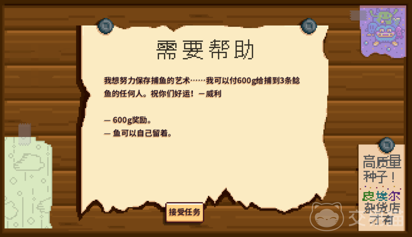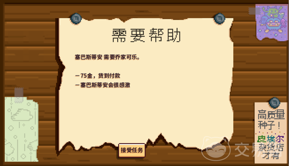 村民任务:这些任务是由村民发布在杂货店的公告栏上的,需要玩家帮助村民完成一些小事,例如送一些物品,找一些物品,打败一些怪物,或者陪村民去某个地方。这些任务可以增加玩家和村民的友好度,获得一些金钱或者物品作为奖励,或者触发一些特殊的事件。例如,帮助艾比盖尔找到她丢失的项链,可以增加两颗心的友好度,获得300金币,以及触发她的心动事件。