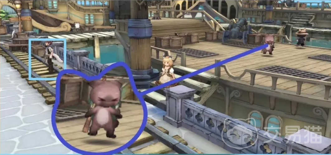 然后要传送到地图的中心位置,这里有一个划船的区域,有很多船只和水面。在这个区域的右边,有一个木制的桥梁,桥梁上有一只橘色的猫咪,它是第四只目标。你和它互动后然后离开这个区域,向地图的左边走。