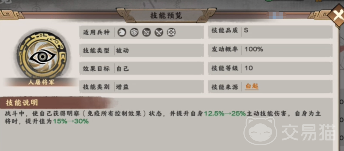 在这款游戏里面,白起也是非常强大的一位英雄。其本身的属性以武力和攻城为主,他本身的统兵能力也是非常强的,基本上步兵和弓弩兵都有着额外的加成。而且他的盾阵可以为兵士提供很高的保护,是目前版本的顶级战将。而且白起虽然属于秦楚阵营,但是其本身的能力和技能却可以跨队使用,是目前很多玩家们物理队中的核心角色。