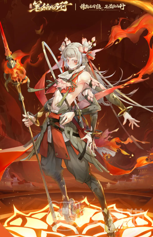 然后是第四位角色,他就是哪吒,大致的形象也和原作差不多,唯一有点差别的就是游戏中的哪吒没有三个头,只有一个头,不过话说回来原作中的哪吒常态下也是只有一个头。能力方面,该角色拥有多种战斗神通,这些战斗神通能让他在战斗中获得强大的潜能,这潜能可以让他自身的暴击率、攻击力、等级、行动力得到提升,另外还可以让他获得火焰能力,该能力可以让他的每次攻击都附带一个灼烧效果,从这几点上来看,他在游戏中也是一位输出类型的角色。