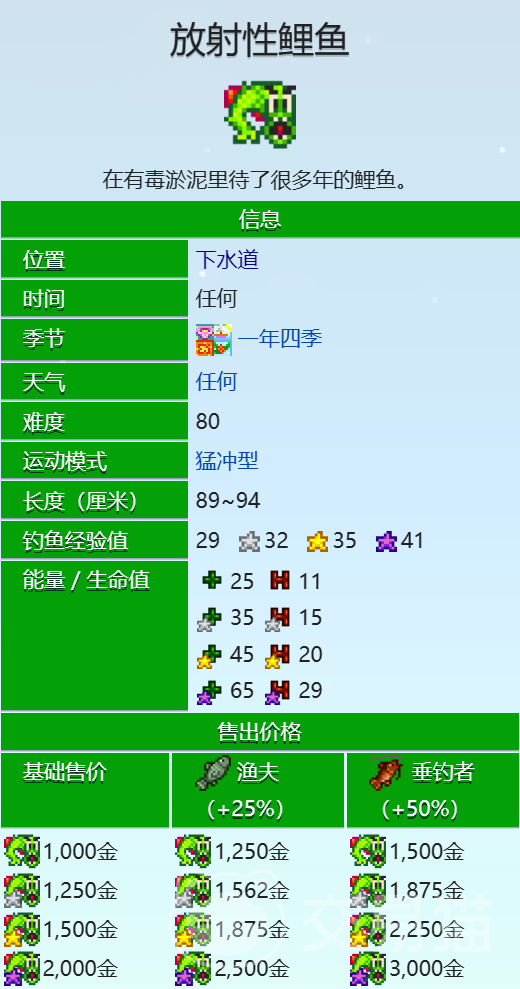 放射性鲤鱼:可以在下水道的中间位置钓到,需要钓鱼等级达到4,浮标必须位于钓鱼区为5的水中,要求同上。如果浮标抛进了钓鱼区为3的钓鱼气泡中,依然可以钓到放射性鲤鱼。它的售价是750金,治疗效果是75点能量和202点生命值。