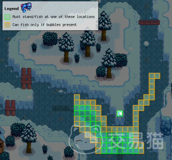 小冰川鱼:可以在农场南边森林池塘的最下面位置钓到,需要钓鱼等级达到5,浮漂位置同上。如果浮标抛进了钓鱼区为3的钓鱼气泡中,依然可以钓到小冰川鱼。它的售价是1000金,治疗效果是100点能量和270点生命值。