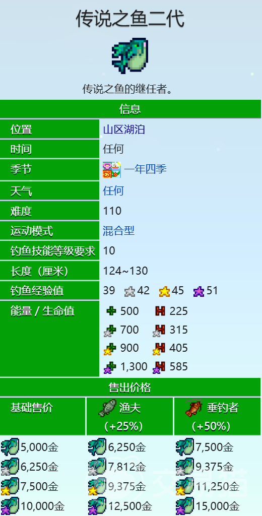 传说之鱼二代:可以在山区湖泊的中间位置钓到,需要钓鱼等级达到10,浮标必须位于钓鱼区指标为5的水中,就是距离岸边(包括桥梁)至少相距5格。如果浮标抛进了钓鱼区为3的钓鱼气泡中,依然可以钓到传说之鱼二代。它的售价是5000金,治疗效果是225点能量和585点生命值。