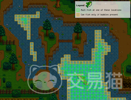 雌鮟鱇鱼:可以在河流的最左边位置钓到,需要钓鱼等级达到6,浮漂位置同上。如果浮标抛进了钓鱼区为3的钓鱼气泡中,依然可以钓到雌鮟鱇鱼。它的售价是900金,治疗效果是90点能量和243点生命值。