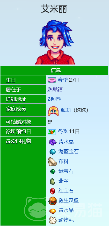 以上就是星露谷物语艾米丽的行程安排和爱心事件的攻略,希望对玩家有所帮助。艾米丽是一个充满正能量和创造力的女孩,如果玩家想要追求她,就得多送礼物多聊天,以快速增加好感度。和她一起分享快乐和冒险。祝玩家能够在星露谷物语中找到自己的幸福。