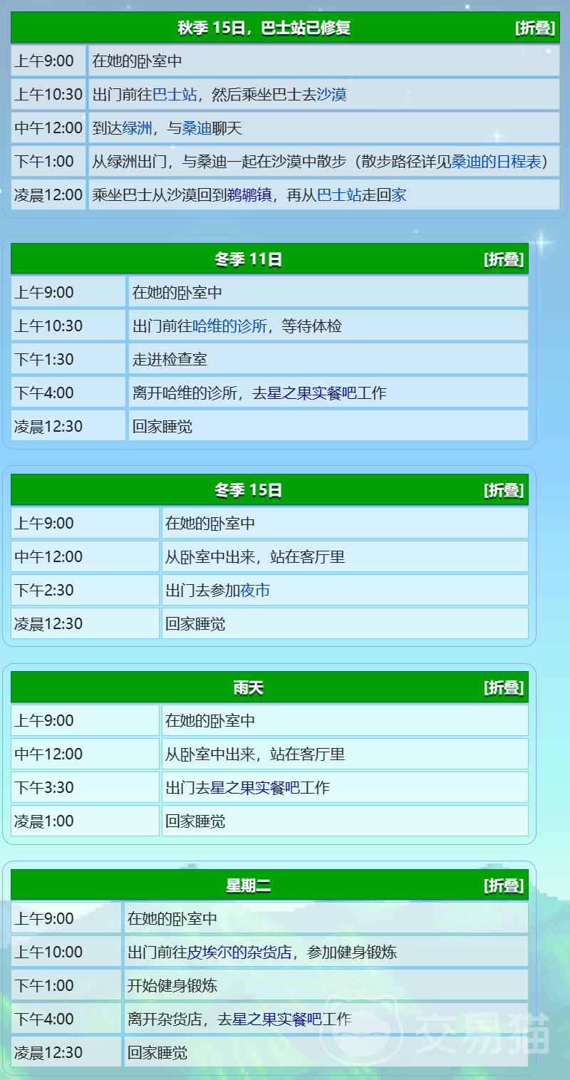 当然,这个安排也会受到一些特殊情况的影响。如果是星期二,她会在上午11点到下午1点去鱼店西侧的码头,然后再去杂货店,最后再去餐吧工作。如果是星期五,而且社区中心已经修复,她会在上午11点到下午1点去社区中心,和其他村民一起参加活动。雨天,她会在上午11点到下午1点去卡朋特商店,然后再去餐吧工作。冬季15日,她会在上午11点到下午1点去冰窖,然后再去餐吧工作。如果是冬季11日,她会在上午9点到下午3点去医院做体检,然后再去餐吧工作。秋季15日,她会在上午9点到下午3点去巴士站,然后再去餐吧工作。如果是姜岛的海滩度假村开通之后,她有时会在上午9点到下午6点去那里度假。