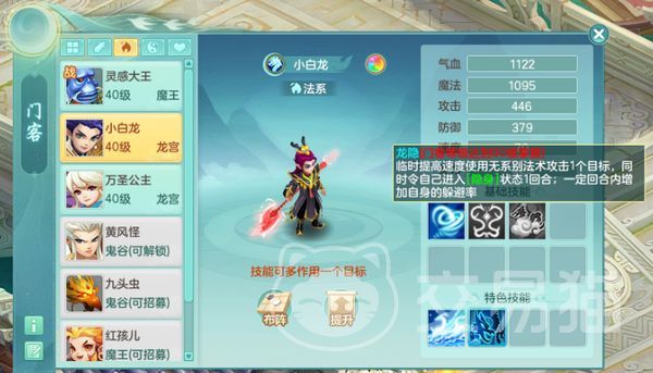 了解他们的具体属性之后,大家还需要去知道对应角色的技能,就比如小白龙,他是法系的一名角色,他的技能主要是龙隐,可以瞬间将自己的速度提高,并且直接攻击一名敌人,而且攻击到敌人之后自己还会进入隐身状态,在该回合还能将自己的闪避率大大提高,就比较适合有一定操作的玩家使用。
