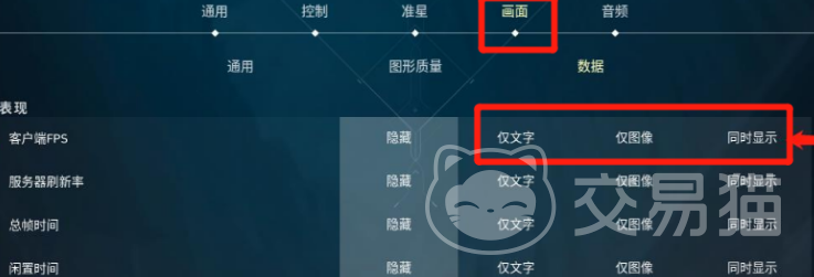 在这个设置界面中,大家可以看到一些基础的选项,从最上方找到【画面】选项,点开这个选项后,大家需要下滑到最底下,然后找到【客户端FPS】选项。然后点击右侧的选项,把【同时显示】【仅图像】【仅文字】这三个打开。