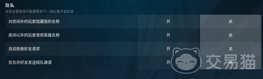找到该类目后在“对房间外的玩家隐藏我的名称”这一项上选择“开”,这样的话你即使处于在线状态,一些其他的玩家也都没法发现你的身影了,这也就相当于变相进入了隐身状态,另外不想隐身又不想接受好友邀请的话也可以把“自动拒绝好友邀请”开启,这其他几项也都是十分好用的功能。