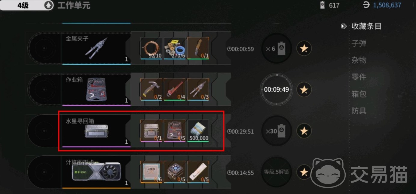 后续的土星箱和木星箱则是7级、9级的时候才会解锁的。如果你有一些资源才可以去金工台制作,但在工作单元只能制作4格的“水星寻回箱”,虽然能存得不多,但好在便宜可以自己做,但建议有条件的还是用格数更多的寻回箱。