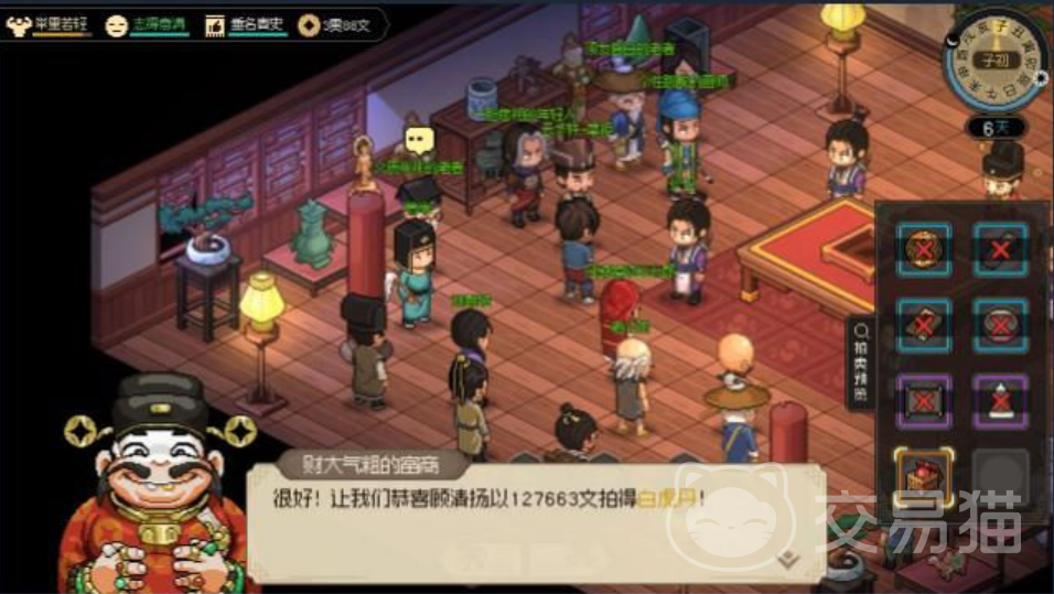 玩家进入珠光宝气楼后,会看到一张桌子,桌子上有一个铜钟,玩家可以选择敲响铜钟,开始拍卖会。拍卖会开始后,珠光宝气楼的老板石万三会介绍本次拍卖会的规则,以及本次拍卖会的拍品数量和种类,拍品分为普通拍品和神秘拍品,普通拍品是固定的,神秘拍品是随机的,每次拍卖会的神秘拍品数量和种类都不同。拍品有不同的等级,分为丁、丙、乙、甲四个等级,等级越高,拍品的价值和稀有度越高,拍卖会的拍品的价格由珠光宝气楼的老板石万三根据拍品的等级、类型、来源、稀有度等因素决定,价格会随着拍卖会的进行而上涨随机性较高。