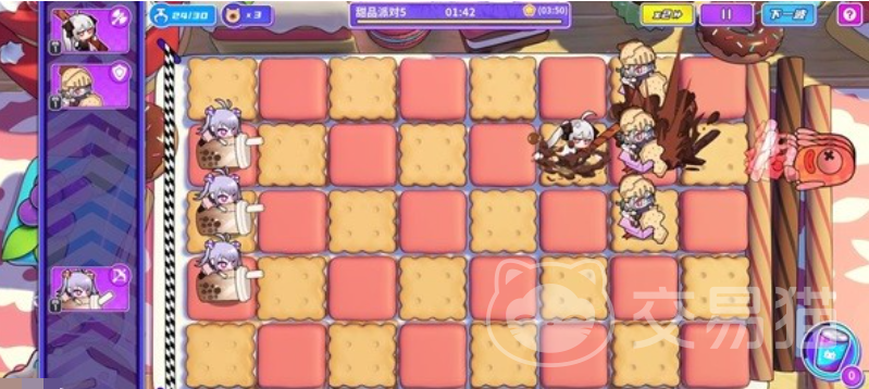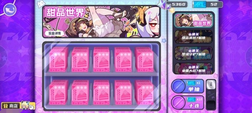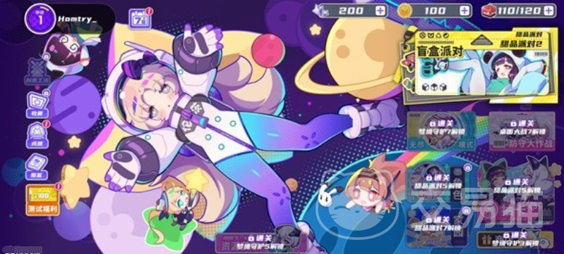 想要拿到三星的话要解锁抽卡功能,这需要打通甜品派对简单5关。这一关有一个冰碗怪物会拖延时间,我们要用能量饮料给卷卷战士加速,让他快速消灭它。如果不知道卷卷战士是哪个角色,可以回到盲盒派对初始页,点击图鉴-微型机,找到它的介绍。通关后,我们就可以在左下角的测试福利和左上角的签到中领取奖励,然后去抽卡。