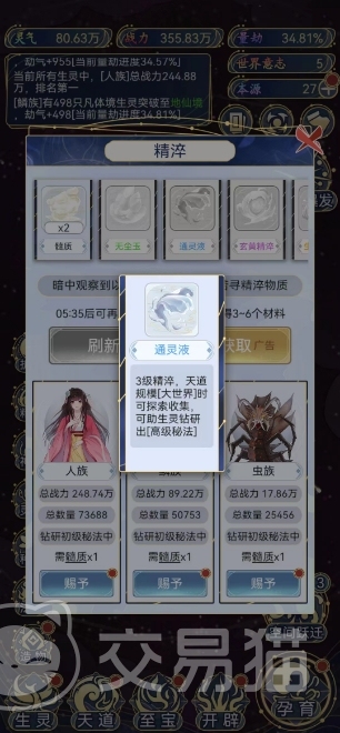 通灵液:3级精淬,天道规模大世界时可探索收集,可助生灵钻研出高级秘法。
