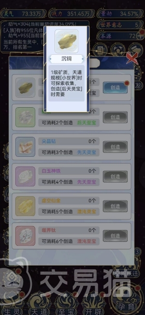 沉铜:属于后天灵宝,也是1级矿质资源,天道规模处于小世界时期可探索收集,在创造后天灵宝时需要。