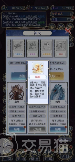 炽烬:1级神火,天道规[小世界时可探索收集磨炼生灵时,最多可诞生1位强者。