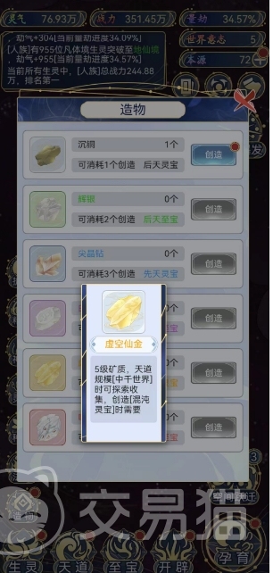 虚空仙金:5级矿质,天道规模中千世界时可探索收集,创造混沌灵宝时需要。