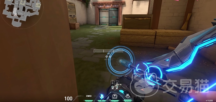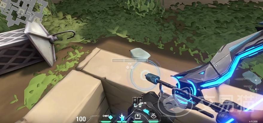 然后是防守方猎枭的第二个点位,它在C包点这个有绿色掩体的角落处,来到这里之后向右边转身,然后如下图所示的那样对准对面巷口的墙面,之后将弓箭蓄力蓄满,然后直接释放,释放之后它会在墙壁上经过几次弹射,最终落到C包外面的一个入口处,其落地后辐射的范围也是非常之大,无论是C包外面的区域,还是C包里面的区域都可以看得一清二楚。