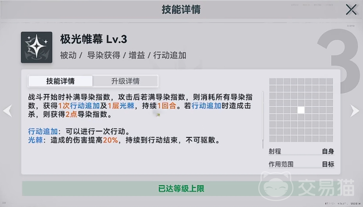 被动技能,极光帷幕,效果为在战斗开始的时候将补满所有的导染指数。若攻击后仍是满导燃指数,则消耗所有的指数获得一次行动追加和光棘效果,使当前的伤害进行一段属性的提高。这意味着,如果搭配好的其他角色辅助的话,那么能够在第一回合打出两次再行动,再加上大招的再启动能力,使得其在具体使用环境下能做到以一敌多的效果。