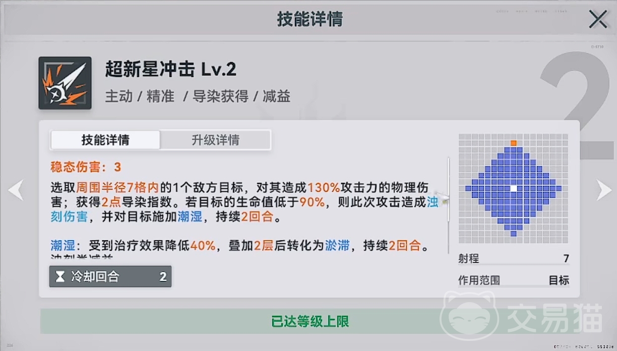 二技能超新星冲击,效果为攻击造成物理伤害之后获得导染指数,如果敌方的生命值低于90,那么此次攻击还会造成浊刻伤害。虽然看起来是物理系技能,但具体使用的话,但凡对面掉了点血,那么该技能都会变成弱点的魔法技能,虽然伤害量不是很高,但在于覆盖广,作为大家的常规主要技能选择。