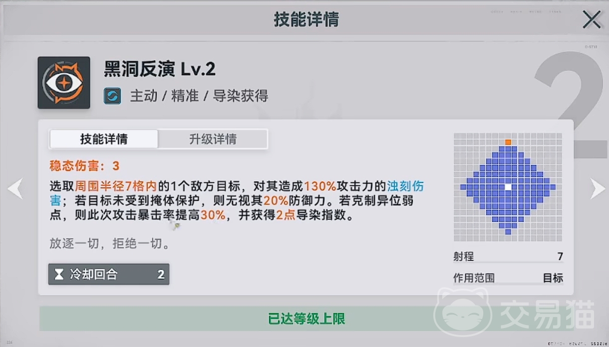 一技能黑洞反演,效果为攻击造成一段浊刻伤害,若该次攻击对敌方造成克制效果,那么,此次的攻击暴击率将提高,并且获得额外的导染指数。常规的输出技能,基本伤害不错,特别是打弱点的时候,暴击伤害能发挥出数倍于其他主动攻击技能的威力。