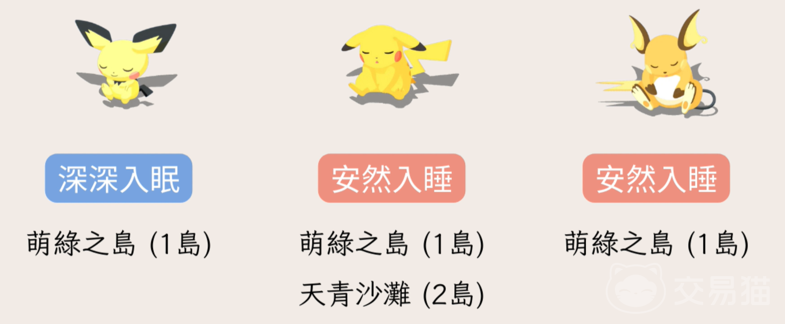 大家如果想去一个新的岛屿尽量先捕捉到对应岛屿的宝可梦比较好,2岛与3岛比较推荐需要打工的小伙伴们,这两个岛卡比兽的树果都比较固定,并且有一些3星的睡姿只有这里才能解锁哦,抓精灵时精准度也会更高一些。
