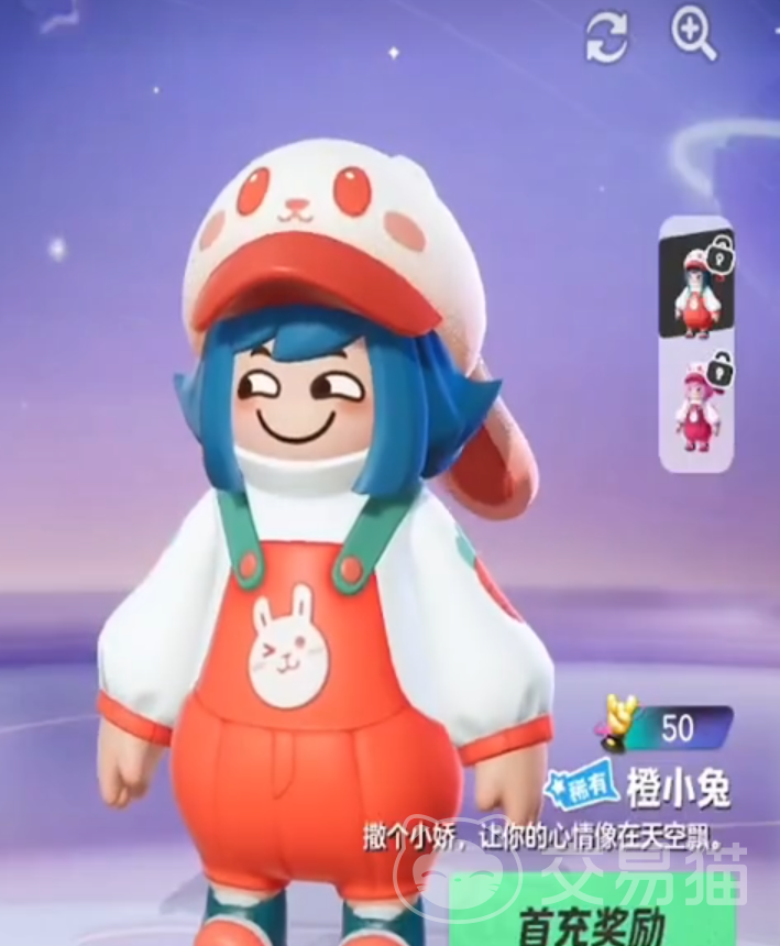 那么说到皮肤,首先要带大家看的是一套充值一块钱即可领取的皮肤,该皮肤叫做橙小兔,这套皮肤中玩家获得一件印有兔子图案的马甲,还获得一个兔子帽,整体看下来非常可爱。