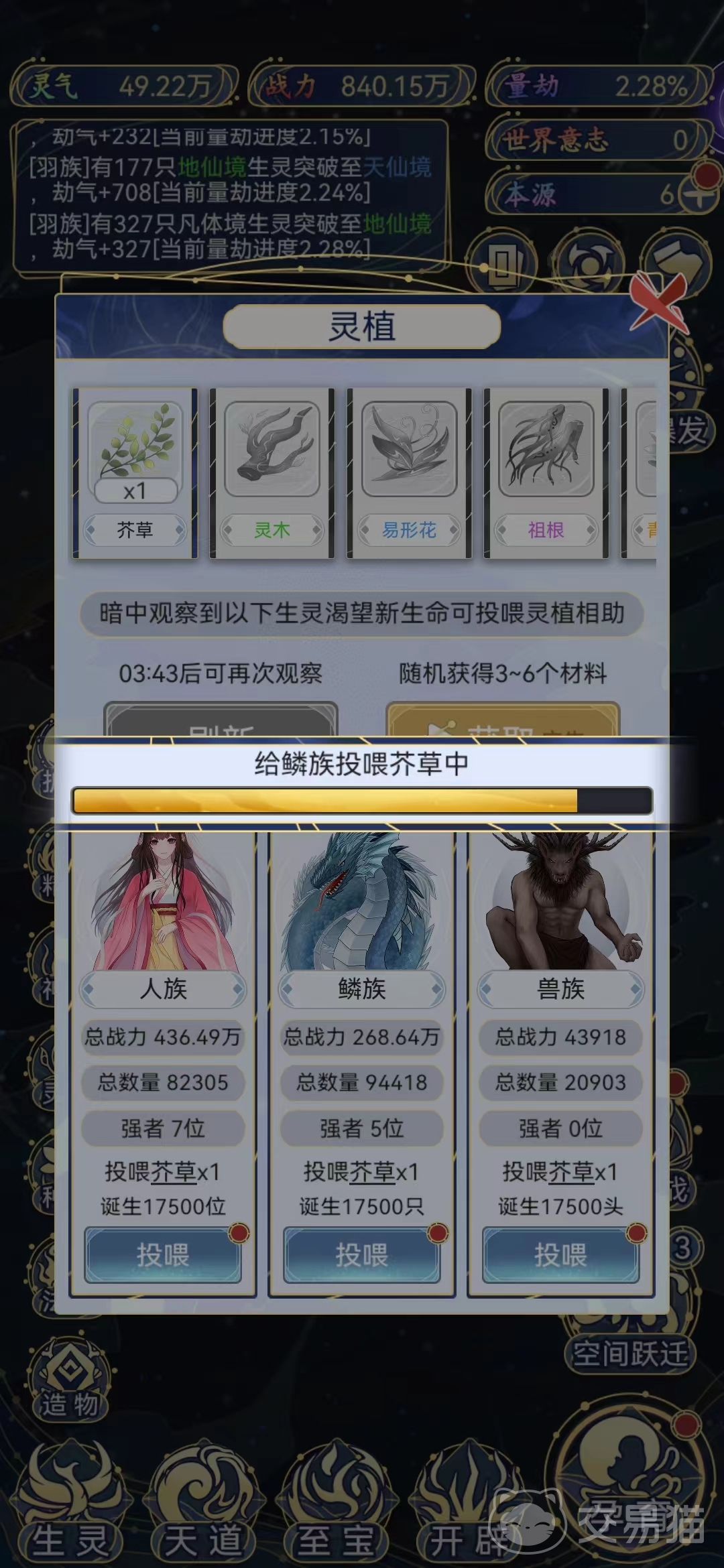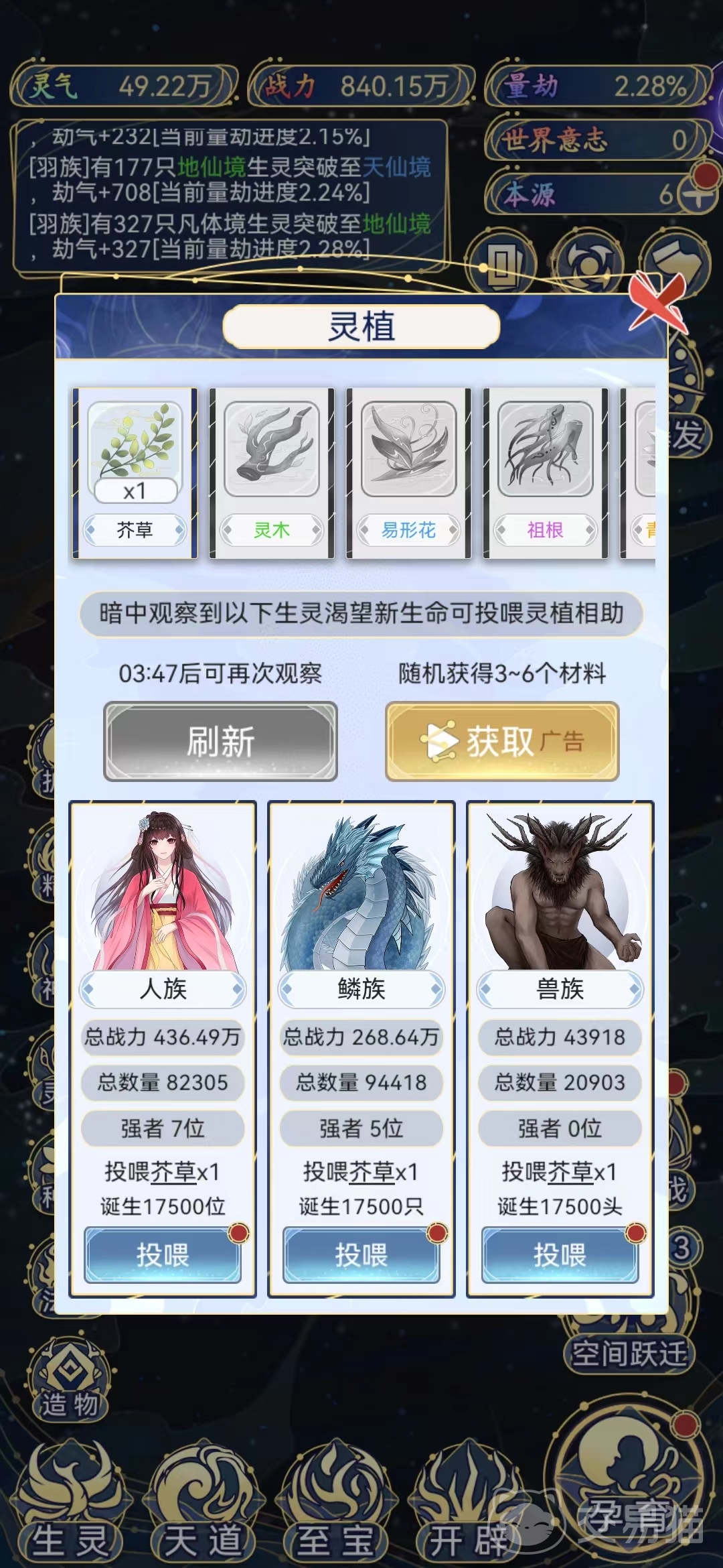 这个时候需要大家去点击刷新,刷新之后出现的种族大家就可以进行投喂啦,而且基本大家投喂的种族都是比较平均的,如果是有针对发展的话,建议大家可以挑选其中的种族进行投喂,要是灵植不够大家还可以通过看广告的方式来获取更多的材料哦。