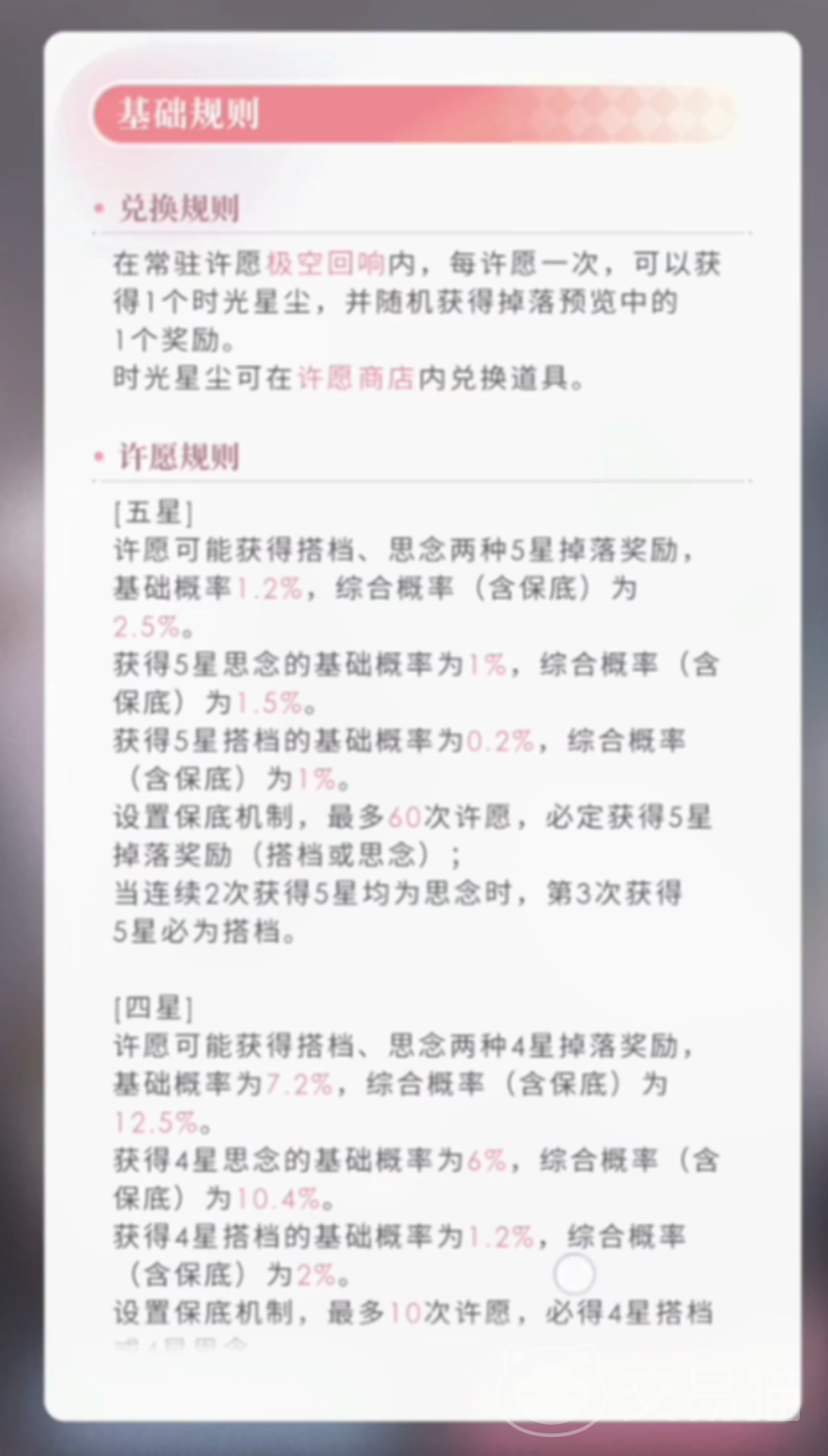 限定抽卡是指在特定的时间段内,玩家可以使用许愿券进行的抽卡,每次抽卡可以获得一张搭档卡或者一件装备。限定抽卡的搭档卡和装备的稀有度分为四种,分别是一星、二星、三星和四星,其中四星的搭档卡和装备是最稀有的,也是最强的。限定抽卡的概率如下:一星搭档卡:40%、二星搭档卡:35%、三星搭档卡:20%、四星搭档卡:5%、一星装备:40%、二星装备:35%、三星装备:20%、四星装备:5%。