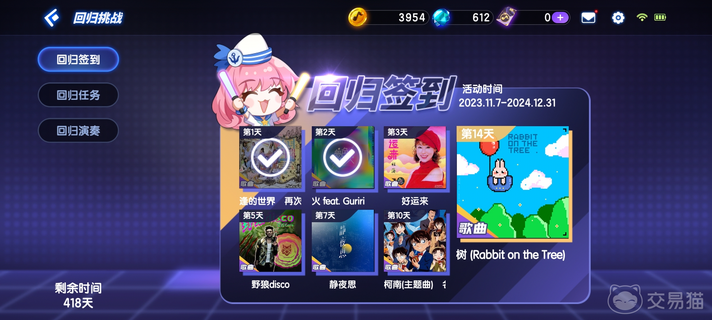除了角色的奖励之外,小伙伴们持续登录七天也是有奖励可以领取的,新老玩家都有,可以获得不少歌曲的资源,解锁了就可以直接去玩了,都是一些经典的歌曲,很多小伙伴都喜欢听的。