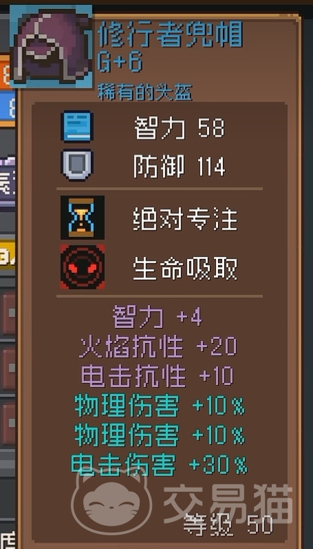 首先第一个便是我们的修行者兜帽,是稀有品质的蓝色装备,很容易能刷到,而且泛用性特别高。常驻词条方面会有着火焰和电击抗性等buff加成,还有着防御力以及一些基础方面的提升效果。当然,更关键的是,他的羁绊加成效果,绝对专注以及生命吸取。