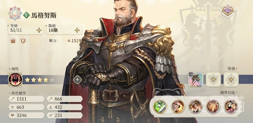 第二个也为大家介绍一个SSR的角色,他叫做马格努斯,这个角色其实在防御能力上面也是很不错的,大家可以在上面通过防御以及辅助带来更多的生存能力,在使用这个角色的时候,其实大家也可以当成是队伍的护盾来用,因为这个角色的技能是可以给全队的成员都带来防御的效果,只要是能够帮助队员带来防御的,在稳定性上面都是非常不错的,如果是有足够的防御这个角色也可以利用辅助技能进行进攻哦。