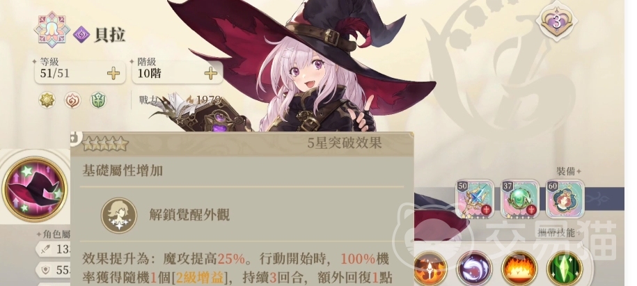在原本自带的技能中,贝拉有一个个性技能,使用这个个性技能时贝拉的魔法攻击效果会有8%-25%的提升效果,而且会有概率每一次行动都带来一听歌增益效果,这个增益效果的等级最起码也是2级的,而且这个效果产生的概率其实也会产生变化,在上面会有50%-100%的概率变化,在星级最高的时候是可以持续3个回合生效的,其余的星级都是2个回合持续有效,使用完之后大家还有机会可以带来能量恢复效果,虽然只有1点但是也足够使用。