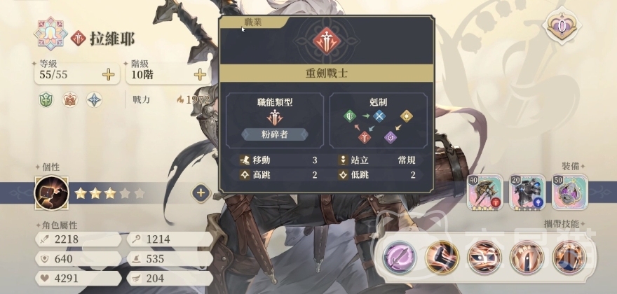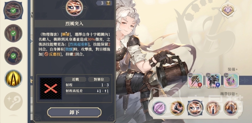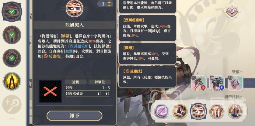 除了个性技能之外拉维耶的普攻就是斩击的技能,使用的时候带来的伤害数值只有85%的伤害而且没有不是属性伤害,一个普通的物理伤害搭配了击退的效果之后还是非常不错的。初始技能是会选择一个固定范围的,在游戏中是会选择地图上面十字范围之内的敌人,但是一次只能选择攻击一位敌人,带来的伤害只有30%的输出,但是这个时候会直接带来一个重击,可以将技能保留2个回回合。