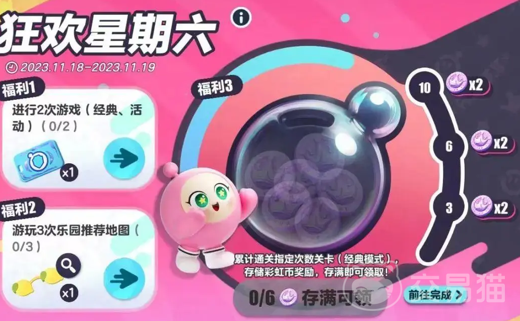3,【狂欢星期六】同样是需要玩家们去完成一些指定的人物,然后就可以免费的获取【巅峰派对】的保护卡,同时还有超级西游搭配师可以获得,当玩家们在游戏中进行闯关的数量发达到了3,6,10次的时候,大家就会解锁2枚【彩虹币】,玩家们一共是可以获得6个彩虹币的,获得彩虹币后,大家需要把这些彩虹币放在【狂欢收集罐】中,彩虹币在这个地方存放满一周后,就可以进行提取了;不过每周的奖励都会进行一个重置哦,大家一定不要忘了在最后一天去进行提取哦!这个活动的任务通常是需要大家去参加一些比较经典的活动,同时打完两次游戏对局,而第二个福利活动就是需要大家去游玩一些刚更新的地图!小编会在下方给大家介绍!