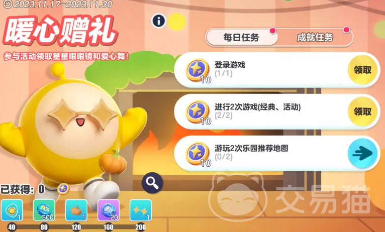 2,【暖心赠礼】本次活动结束的时间是在11月30号,活动时间还剩比较长的,打击在游戏中完成一些任务后,就可以获得大量的【星星币】,当玩家们获得的星星币达到一定数量的时候,就可以去兑换超级西游的配饰【甜南瓜】和【星星小眼睛】了,同时还给大家准备了免费的动作【爱心舞】可以领取哦;不过大家需要注意的是,本次的活动任务分成了每日任务,每日任务是固定三个的,通常都是一些对战活动,而成就任务则是跟本次感恩节更新的地图有关系哦!