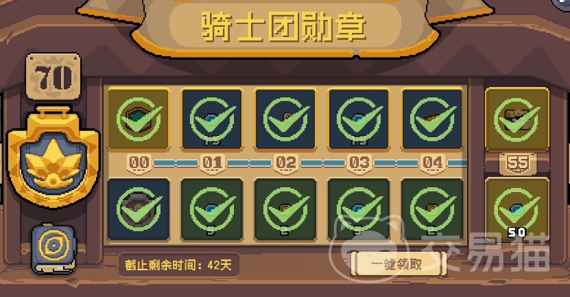 进去之后你会发现它有两排进度,每到达一个进度都会有对应的奖励,而那比较豪华的一排就代表的是黄金勋章,而它与一开始就免费开启的骑士团勋章是不同的,想获取黄金勋章的话需要花费一定数量的小鱼干进行解锁,而黄金勋章本身也分出了两个版本,普通的黄金勋章仅需花费360小鱼干即可解锁,而豪华版的则需要花费足足720小鱼干才能解锁,两者的最大区别就是解锁后的初始等级,豪华版等级会高一些,变相的为玩家节省了一部分肝的时间。