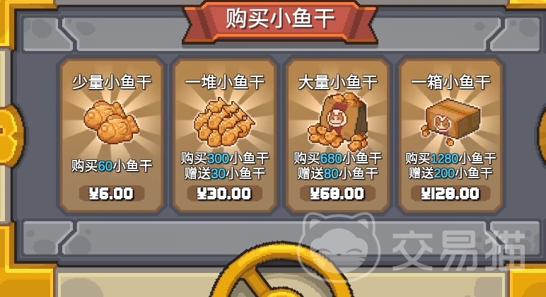 除了开勋章,另一种获取小鱼干的方式就是直接充值购买了,单充最低要充6元,但只能买到60小鱼干,所以不如多充一些,其中充30送30小鱼干,充68送80小鱼干,充128送200小鱼干,变相的也算是打折了。