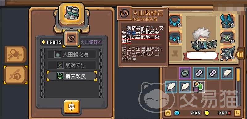 目前游戏内的火山熔铸石主要是作为一种装备锻造材料来进行使用,它本身的品质高达传奇级别,所以在获取的时候难度也会比一般的锻造石更大,不过使用起来还算是比较简单的,只要前往秋梨村找到铁酱,之后选择有羁绊的装备进行锻造即可。