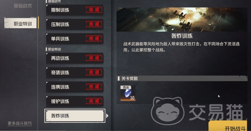轰炸训练其实是在职业特训当中可以体验到的一个关卡,大家在参与轰炸训练的时候需要利用战术武器给敌人带来伤害,在上面会出现各种不同的地形,如果大家想在上面掌握优势的话,其实整个战局都是可以依靠道具来掌握住的,在轰炸的过程中大家需要注意火箭打出的范围基本都是3*3的范围。